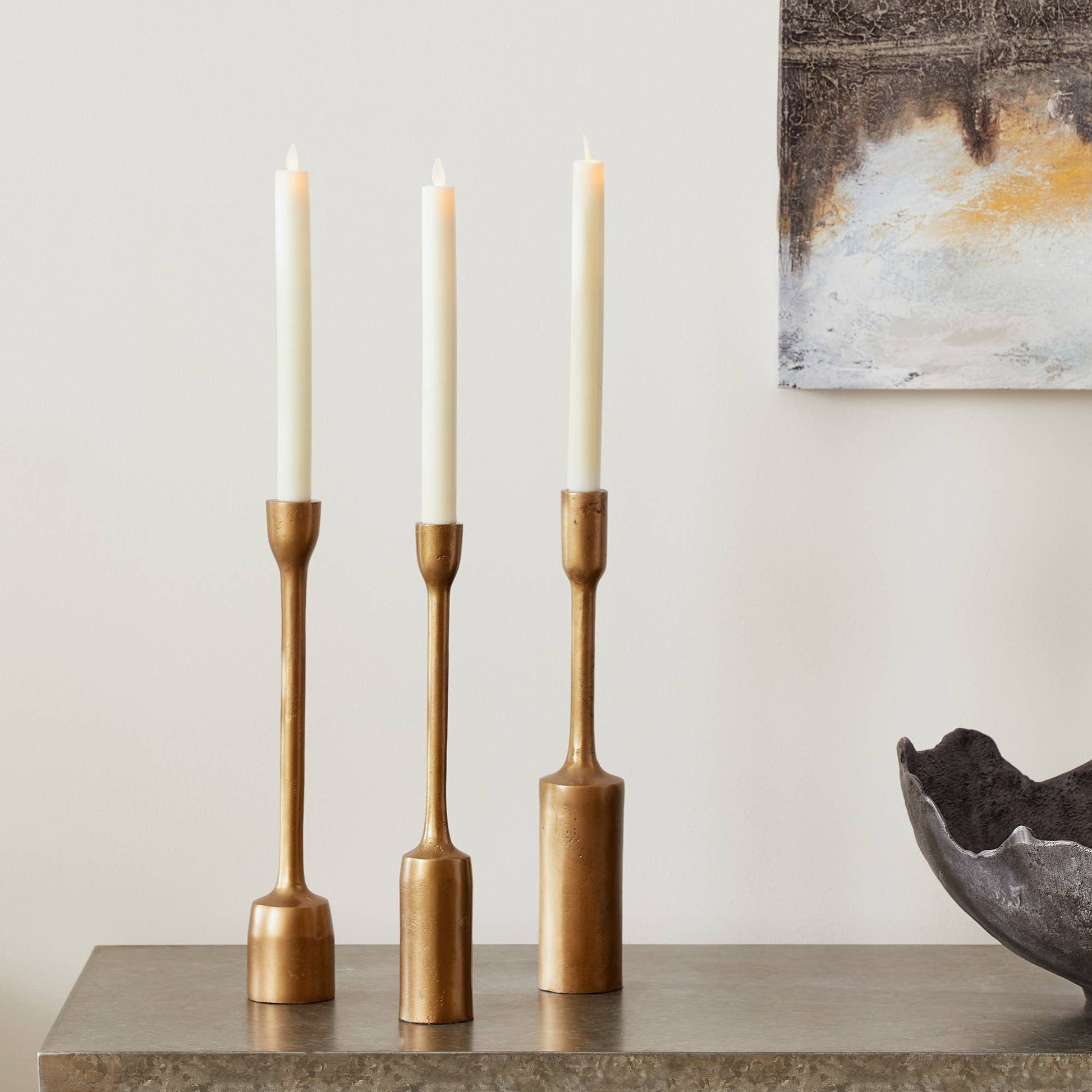 In a solid antique brass, these candleholders are substantial pieces. Pair with our LightLi tapers and create a glowing centerpiece. Color: Antique Brass. Set of 3 Included (2.5 x 2.5 x 14, 2.25 x 2.25 x 14, 2 x 2 x 13.5), Use LED candles only, Candles not included. Interior use. Clean with damp cloth. Avoid chemicals that may be harmful to finish. Never leave a burning candle unattended. Use only LED flameless candles when specified. Like you, we believe in the beauty of home. Background about brand: "In 2000 we were founded in Napa, California, with one simple goal: to help elevate each & every living space. Over the years we have forged relationships with many of the world’s best artisans, allowing us to offer you selections that are curated, crafted, and contemporary. From the front hall to the back garden, furniture and lamps to chinoiserie and lighting, Napa is there to help make everything beautiful."
