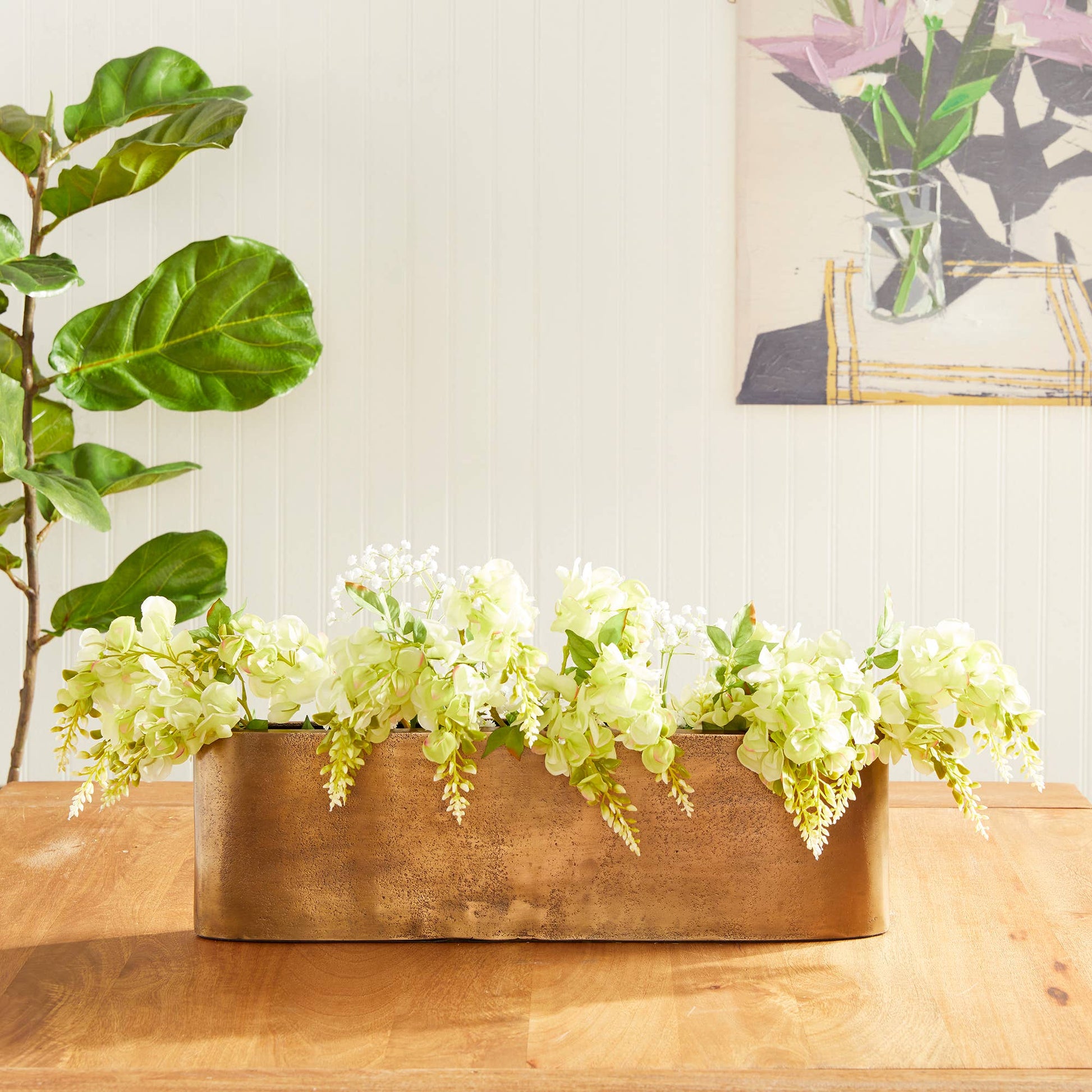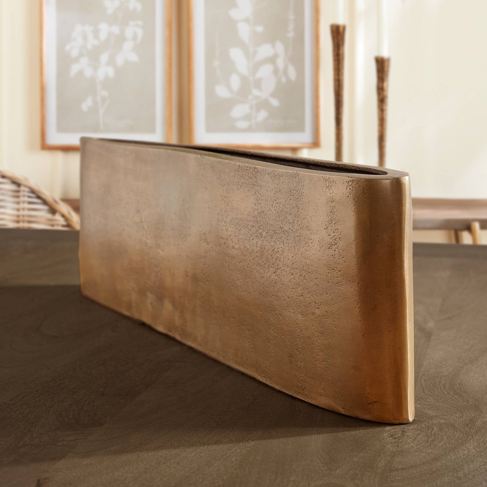 With an unexpectedly long and narrow shape, this abstract metal vase is made for the contemporary space. Well-scaled, with an organic rim, it makes an intriguing centerpiece for fresh blooms. Perfect for a dramatic tablescape, the possibilities are endless! Color: Antique Brass . Interior use only. Clean with damp cloth. Dry immediately. Avoid harsh chemicals Like you, we believe in the beauty of home. Background of the brand: "In 2000 we were founded in Napa, California, with one simple goal: to help elevate each & every living space. Over the years we have forged relationships with many of the world’s best artisans, allowing us to offer you selections that are curated, crafted, and contemporary. From the front hall to the back garden, furniture and lamps to chinoiserie and lighting, Napa is there to help make everything beautiful."