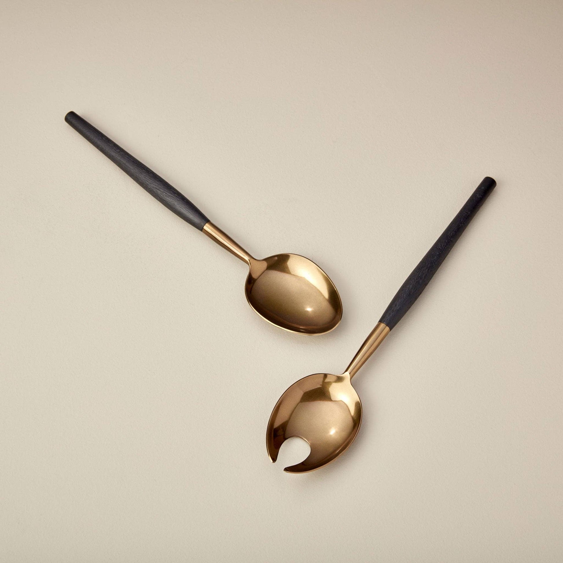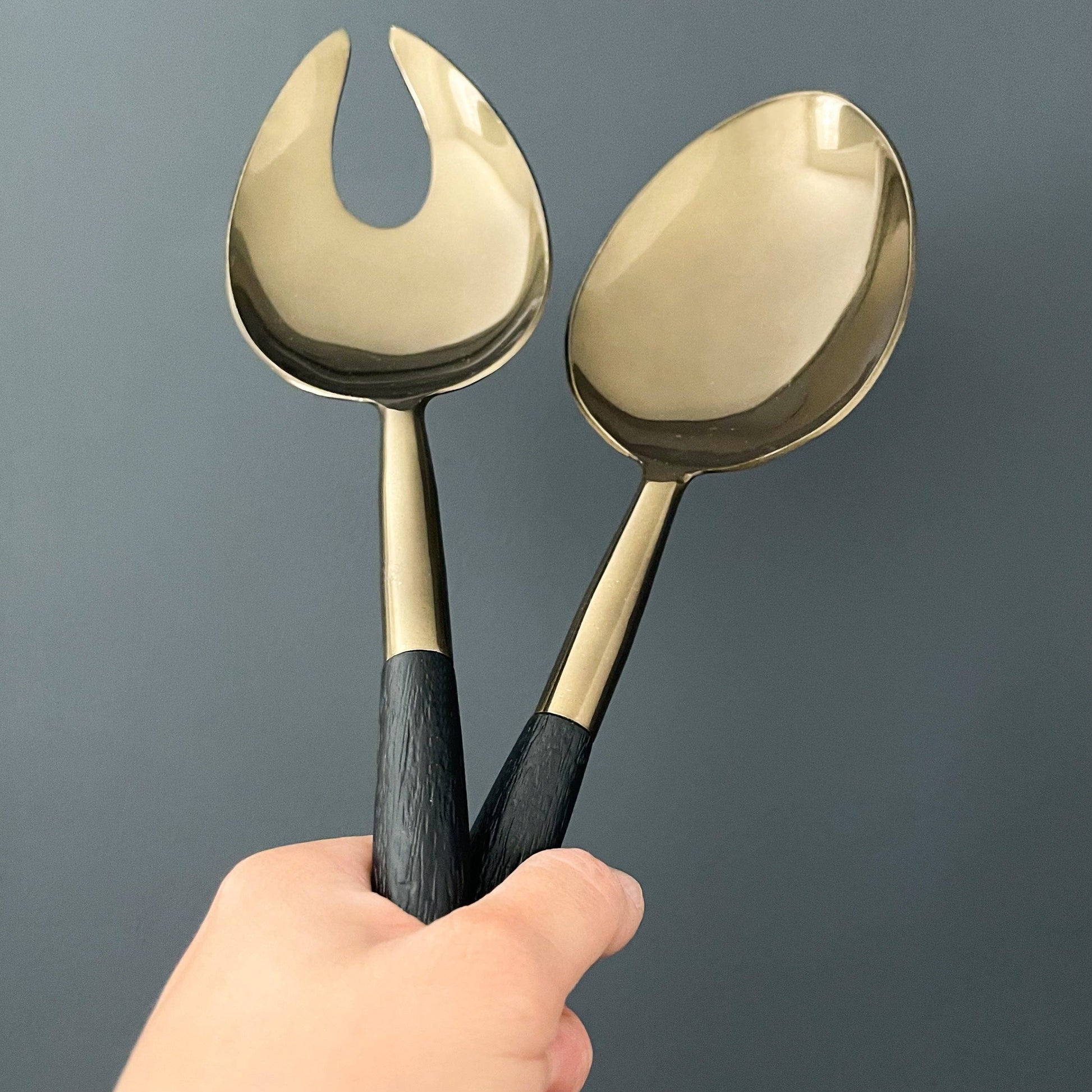 These sleek salad servers feature a beautiful brass finish that is elegant and ease to clean, against black stained mango wood handles for a rustic touch. Material: Stained Black Mango Wood and Brass. Dimension: 33.5 x 7 cm