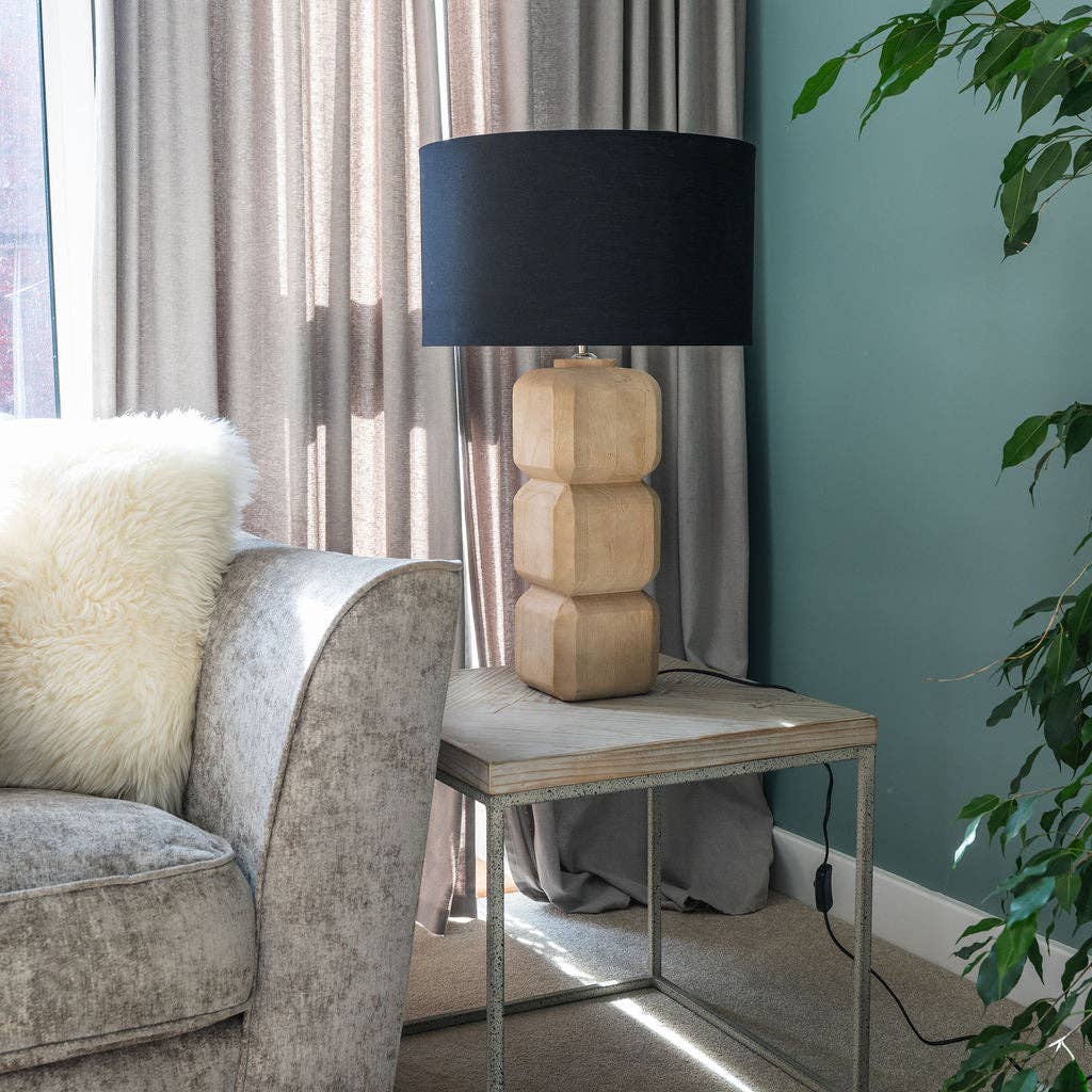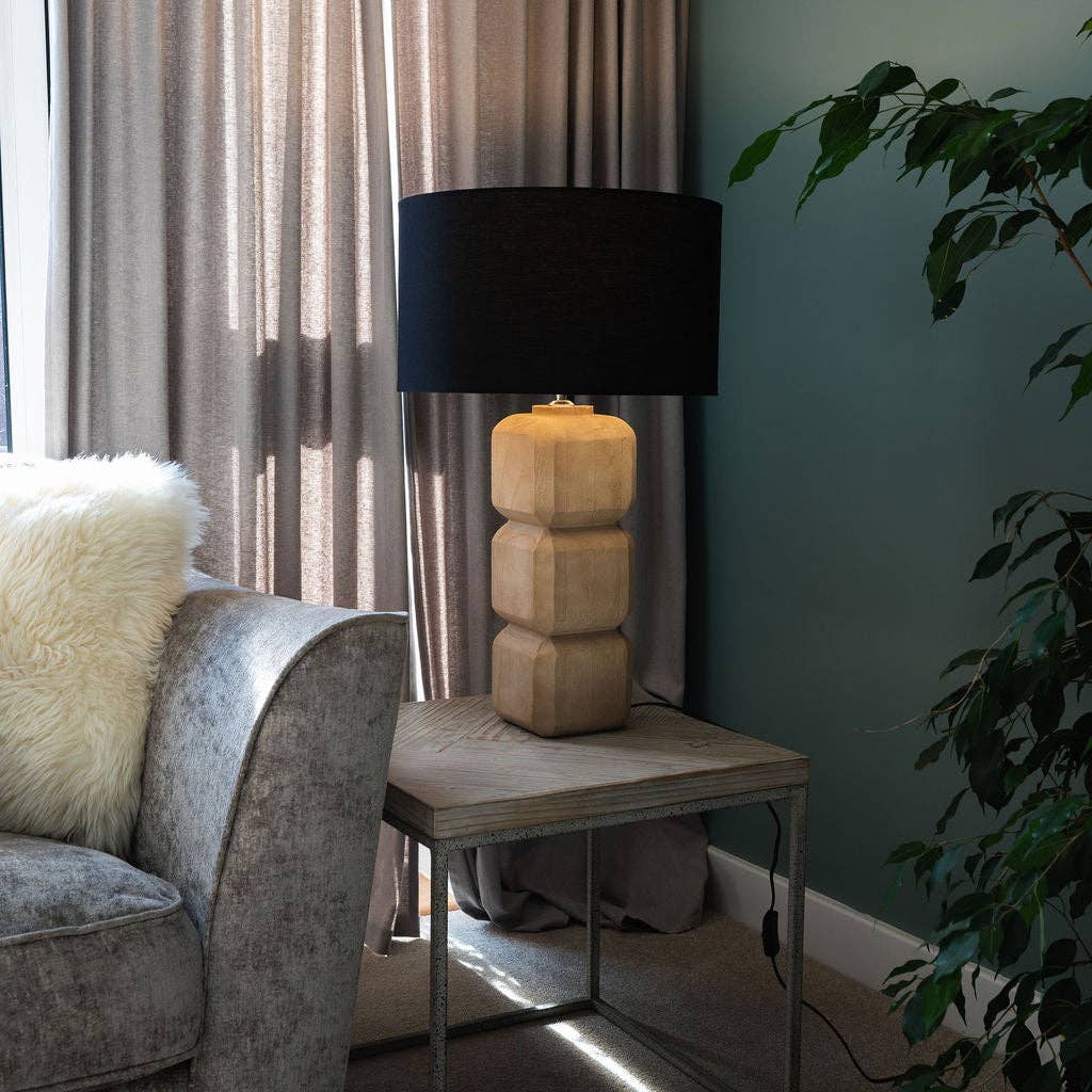 Yatton, Large Carved Wooden Table Lamp with Black Shade