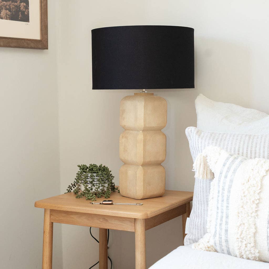 Illuminate your space with the luxurious Yatton Table Lamp. Handcrafted in India from mango wood, this lamp exudes a textured, scandi feel with its sandblasted grain and almond-colored finish. The Black Cotton drum shade adds a touch of sophistication to any room. Elevate your decor with this exquisite piece. Total Height: 66 cm Shade: Black Cotton, 41 cm Dia x 23cm H Base Size: 15 cm x 15 cm (E27 Bulb - Not included)